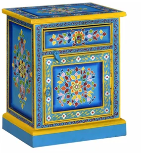 Szafka jest ręcznie wykonana z drewna mango, które jest trwałe i piękne, a kunszt wykonania dodaje spektakularnego stylu retro. Każdy etap procesu jest wykonywany z największą starannością, czy to polerowanie, malowanie czy lakierowanie. Ten stolik nocny wyposażony jest w obszerne ręcznie malowane elementy dekoracyjne, które tworzą ciepły i bogaty efekt.