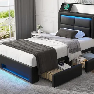 Łóżko z szufladami 90x200 cm ze sztucznej skóry - z diodami LED i portami ładowania (przewodowymi i bezprzewodowymi) - Czarne