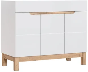 Szafka pod umywalkę BALI w stylu skandynawskim Szafka pod umywalkę BALI to stojąca, szeroka szafka do łazienki w stylu skandynawskim. Szafka wykonana jest z płyty laminowanej w kolorze białym z frontem w białym połysku z elemntami dąb wotan. Fronty szafki wyposażóne są w modne frezowane uchwyty, za pomocą których łatwo otworzymy i zamkniemy drzwiczki. Szafka o szerokości 100 cm zapewni dużą ilość miejsca do przechowywania zarówno kosmetyków jak i środków do czyszczenia, które są niezbędne w każdej łazience. Duży zlew, który można dokupić w opcji dodatkowej ułatwi codzienną higienę ciała.