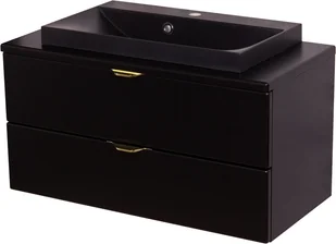Szafka łazienkowa w czarnym matowym kolorze i złotymi uchwytami wraz z prostokątną białą dolomitową umywalką z serii VICTA. Umywalka posiada otwór na baterię.