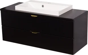 Szafka łazienkowa w czarnym matowym kolorze i złotymi uchwytami wraz z prostokątną białą dolomitową umywalką z serii VICTA. Umywalka posiada otwór na baterię.