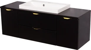 Szafka łazienkowa w czarnym matowym kolorze i złotymi uchwytami wraz z prostokątną białą dolomitową umywalką z serii VICTA. Umywalka posiada otwór na baterię.