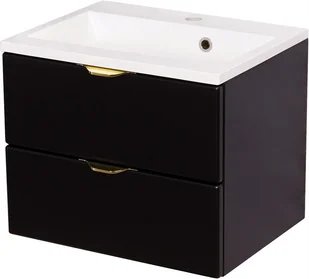 Szafka łazienkowa w czarnym matowym kolorze i złotymi uchwytami wraz z prostokątną białą dolomitową umywalką z serii VICTA. Umywalka posiada otwór na baterię.