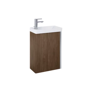 Set Spring 45 cm, 1 drzwiczki, wyposażony w 1 półkę z regulowaną wysokością. Wykonany z materiałów wysokiej jakości, front i korpus z płyty laminowanej, lakierowanej w kolorze orzech lincoln, okucia z funkcją cichego, miękkiego samodomyku. Uchwyt boczny, metalowy w kolorze chrom. Set składa się z szafki podumywalkowej i umywalki.