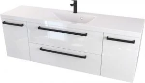 Szafka Wisząca Z Umywalką ATH 140 cm D - Biały Wysoki Połysk - Uchwyty Czarne Matowe