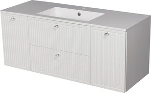 Szafka łazienkowa wisząca 120 cm w białym matowym kolorze z pionowymi frezami imitującymi lamele wraz z białą, dolomitową umywalką z serii Argento Gante.