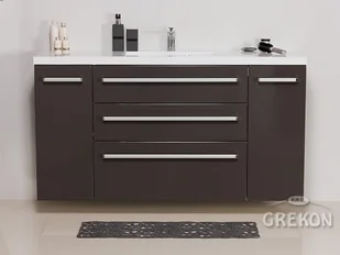 Szafka łazienkowa wisząca o szerokosci 140 cm. Zestaw z dolomitową umywalką - meble wykonane są w kolorze szarym.