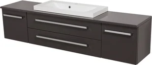 Szafka łazienkowa wisząca o szerokosci 180 cm. Zestaw z dolomitową umywalką - meble wykonane są w kolorze szarym.