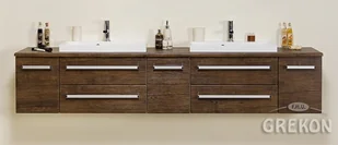 Nowoczesna szafka łazienkowa wraz z prostokątną, dolomitową umywalką z serii FOKUS w kolorze antycznego drewna rozmiar 210 cm.