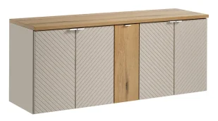 Za pięcioma frontami – czterema kaszmirowymi z eleganckim frezowaniem w jodełkę oraz jednym środkowym w dekorze naturalnego drewna – kryją się aż trzy niezależne komory z łączną liczbą sześciu praktycznych półek. Taki układ pozwala wygodnie posegregować wszystkie akcesoria łazienkowe – od ręczników, przez kosmetyki, po środki czystości. Szeroki blat może posłużyć jako przestrzeń na dekoracje lub funkcjonalne organizery. To mebel, który imponuje pojemnością, ale nie przytłacza – dzięki przemyślanej bryle i starannie dobranym detalom. Więcej miejsca, więcej porządku, więcej stylu Aż pięć uchylnych frontów – łatwy dostęp do trzech oddzielnych wnętrz.