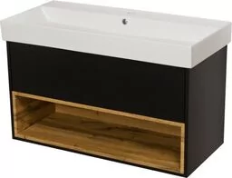 Szafka łazienkowa czarna loft 98cm SPACE z umywalką ceramiczną SPA-C-U100/43 + STANCE-100 Nowoczesna, bardzo ekskluzywna szafka łazienkowa z serii Space w czarnym, matowym kolorze ze wstawką w kolorze naturalnego drewna wraz z prostokątną, ceramiczną umywalką. Umywalka posiada otwór na baterię. Szafka posiada jedną szufladę. Szafka wyposażona jest w system cichego domykania , który sprawia, że szuflada w ostatniej fazie zamykania zwalnia, aby niemal bezgłośnie się zamknąć. Meble łazienkowe GANTE Space Seria mebli łazienkowych Space to innowacyjny komplet o futurystycznym wyglądzie.