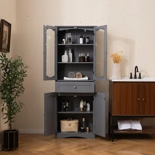 ——Różne opcje przechowywania: szafka łazienkowa posiada 1 szafkę z przeszklonymi drzwiami, 1 dużą szufladę i 1 szafkę z podwójnymi drzwiami, co pozwala na ukrycie lub wyeksponowanie różnych przedmiotów. Można w niej przechowywać ręczniki, kosmetyki, produkty do pielęgnacji skóry, artykuły toaletowe lub ozdoby.