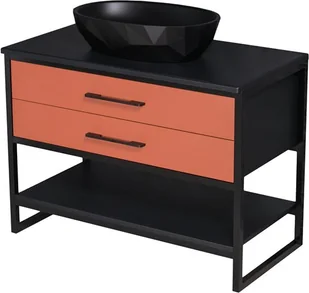 Szafka łazienkowa 100 cm New York Gold w ceglastym macie z czarną nablatową umywalką to wyrazisty mebel w stylu loftowym. Geometryczne fronty, otwarty stelaż i trwała konstrukcja z MDF-u zapewniają nie tylko styl, ale i funkcjonalność. Ciche domykanie i tylny syfon w zestawie.