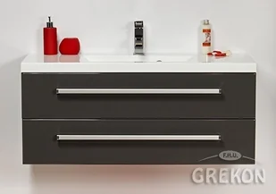 Szafka łazienkowa wisząca o szerokosci 100 cm. Zestaw z dolomitową umywalką - meble wykonane są w kolorze szarym.