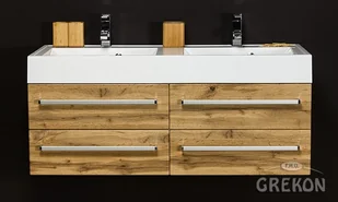 Szafka łazienkowa wisząca z umywalką o szerokosci 120 cm. Zestaw z dolomitową umywalką - meble łazienkowe w kolorze naturalnego drewna seria Fokus NE Gante.