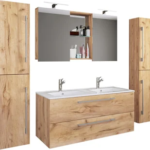 - 1x szafka dolna z dwoma szufladami- 1x podwójna umywalka wykonana z ceramiki- 1x szafka lustrzana z dwoma drzwiami, oddzielona dwoma widocznymi półkami 2x wysoka szafka z dwoma drzwiami każdy i cztery przedziałyZestaw mebli łazienkowych składa się z dolnej szafki z dwiema szufladami każdy z dwoma szufladami Nowoczesna podwójna umywalka wykonana z solidnej ceramiki, która nadaje Twojej łazience wyjątkową atmosferę, służy jako przyciągająca wzrok.