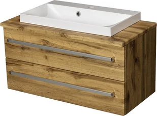 Szafka łazienkowa wisząca z umywalką o szerokosci 80 cm. Zestaw z dolomitową umywalką - meble łazienkowe w kolorze naturalnego drewna seria Fokus NE Gante.