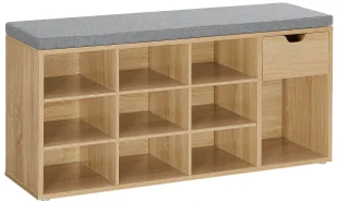 Z tego powodu jest to tak istotne, aby był urządzony komfortowo, a jednocześnie reprezentacyjnie. Szafka na buty z siedziskiem Elian posiada aż 10 wygodnych półek na buty oraz praktyczną szufladę na drobiazgi. Jej nowoczesny design połączony z ponadczasowym dębem sonoma rozjaśni Twoje wnętrze i doda mu niepowtarzalnego uroku. Wygodne siedzisko posiada komfortową poduszkę wykonaną z tkaniny imitującej len. Dzięki mocowaniu na rzepy bez problemu możesz ją uprać w razie zabrudzenia.