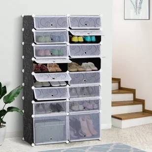 Montaż modułowej szafy marki HOMCOM jest nie tylko prosty i praktyczny, ale także przyjemny! Puść wodze fantazji i dostosuj szafę do swojego pomieszczenia - dzięki prostemu systemowi wtykowemu postawisz ją pod schodami lub w wąskiej wnęce. Panele wykonane z tworzywa sztucznego i metalowe ramy powlekane proszkowo są trwałe i wyjątkowo łatwe w pielęgnacji. Tu wszystko znajdzie swoje miejsce a dzięki półprzezroczystym białym drzwiczkom szybko wszystko znajdziesz. Jako szafa na buty, meblościanka lub uniwersalne miejsce do przechowywania - ta szafa o eleganckim czarno-białym designie i ładnym wzorze to świetne rozwiązanie przechowywania w każdym miejscu. Opis: o Wielofunkcyjny system do utrzymania porządku, można używać, gdy jest otwarty i zamkniętyo Łatwy montaż dzięki systemowi wtykowemuo Łatwa do czyszczenia i trwała konstrukcja z tworzywa i metaluo 14 małych i 2 duże półki zapewniają dużo miejsca do przechowywaniao Mieści do 32 par butówo Łatwe otwieranie za pomocą metalowych otworów w każdych drzwiczkacho Przejrzyste przechowywanie z półprzezroczystymi drzwiczkamio Łatwy montaż Dane techniczne: