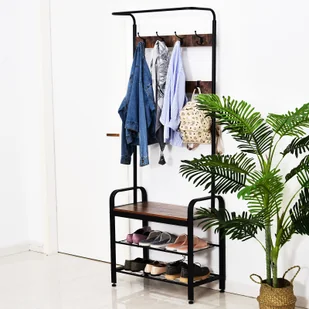 Opis: o $38 Doskonały do przechowywania w jednym miejscu butów, płaszczy, toreb itd. ;o $39 Wieszak posiada szafkę na buty i osiem haków do powieszenia;o $40 Wykonany z płyty MDF jest bardzo wytrzymały i trwały;o $41 Szafka na buty może również służyć jako ławka przy zakładaniu i zdejmowaniu butów;o $42 Cztery regulowane stopki zapewniają doskonałą stabilność w przypadku nierównego podłoża;o $43 Dwa paski zapobiegające przewróceniu sprawiają, że stojak jest bezpieczny w użyciu;o $44 Niezbędny montaż. Dane techniczne: o $45 Kolor: czarny + naturalny;o $46 Materiał: