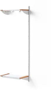 Moduł dodatkowy jest wyposażony w jeden słupek ścienny, na którym należy zahaczyć boczne krawędzie półek. Z drugiej strony półki należy zawiesić na słupku modułu podstawowego. Perforacja na słupkach pozwala umieścić półki na dowolnej wysokości. Zarówno półka na nakrycia głowy, jak i stojak na obuwie wykonano z rur stalowych z elementami z drewna dębowego.