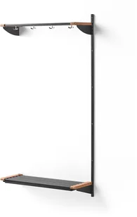 Moduł dodatkowy jest wyposażony w jeden słupek ścienny, na którym należy zahaczyć boczne krawędzie półek. Z drugiej strony półki należy zawiesić na słupku modułu podstawowego. Perforacja na słupkach pozwala umieścić półki na dowolnej wysokości. Zarówno półka na nakrycia głowy, jak i stojak na obuwie wykonano z rur stalowych z elementami z drewna dębowego.