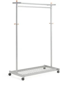 Stojak ubraniowy. Metalowy wieszak z drewnianymi detalami. Wyposażony w koła, półkę na nakrycia głowy i stojak na obuwie oraz drążek z miejscem na 40 wieszaków. W zestawie 6 szt. wieszaków. Miejsce na buty i nakrycia głowyZawiera 6 wieszakówKoła samonastawneElegancki i wszechstronny wieszak z metalu lakierowanego na kolor aluminium z gustownymi dodatkami z drewna.