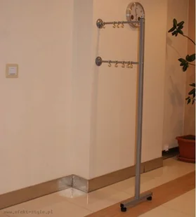 Wieszak mocowany do ściany, na stopkach. Składa się z haków 8 ( haki przesuwne ) i z rurki chromowanej do powieszenia wieszaków szatniowych w ilości około 10szt w zależności od długości wieszaka i objętości ubrań.