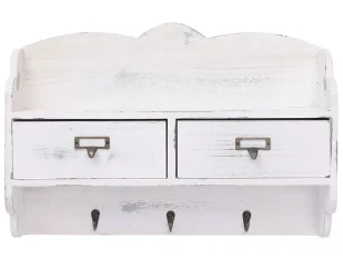 Hollie to elegancki wieszak ścienny w stylu vintage który doskonale ozdobi nasze wnętrze dodając mu wyjątkowego charakteru. Niesamowity efekt zużycia sprawia, że mebel zwraca na siebie uwagę i zachwyca nietuzinkowym stylem. Wieszak Hollie ma 3 wytrzymałe na obciążenia haczyki oraz półkę na której możesz postawić np. torebkę. Posiada także dwie szuflady, które świetnie sprawdzą się na przechowywanie czapek, rękawiczek lub ważnej korespondencji, która wciąż miesza się w losowych szufladach w domu i w efekcie ciężko ją odnaleźć. Designerski wieszak ścienny Hollie wykonany jest z drewna.