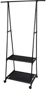 Regał stojący, garderoba z uchwytem na wieszaki i dwiema półkami. Regał wykonany z metalu, półki z włókniny poliestrowej. Tego rodzaju regał świetnie posłuży w łazience na szlafroki, ręczniki. W przedpokoju na kurtki, czapki, buty i inne akcesoria. Przyda się także w sypialni czy garderobie.