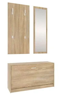 Materiały: wysokiej jakości płyta meblowa o gęstości do 684 kg/m3 zapewniająca wytrzymałość i stabilność; szkło hartowane o wytrzymałości do 120 N/mm2 na zginanie oraz około 700-900 N/mm2 na ściskanie. Kolor: dąb sonoma. Kliknij w link i sprawdź także inne zestawy do przedpokoju dostępne w naszej ofercie. Produkt posiada certyfikat jakości "Edinos Standards DSI 804", który potwierdza najwyższą jakość wykonania mebla oraz pełny stopień zgodności poszczególnych jednostek wytworzonego wyrobu z przyjętym wzorcem. Bardzo łatwy montaż (w zestawie znajduje się czytelna i dokładna instrukcja montażu).