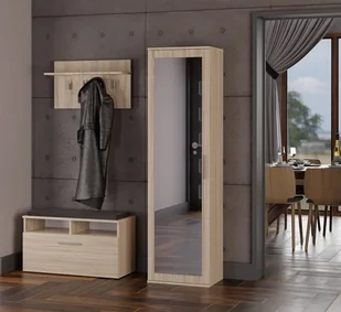 Wymiary szafy z lustrem: głębokość - 35 cm, wysokość - 180 cm, szerokość - 50 cm Materiał: korpus i fronty - płyta laminowana 16 mm, obrzeża - wykończone tworzywem PCV, charakteryzującym się wytrzymałością chemiczną i mechaniczną Kolor: DĄB SONOMA Przeznaczenie: do przedpokoju, do korytarza Styl: