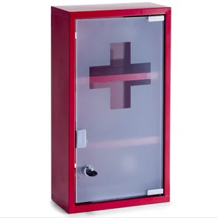 Szafka do przechowywania leków i środków medycznych z wysokiej jakości metalu malowanego na kolor czerwony. Sprawdzi się w każdym domu, gabinecie lekarskim, zakładzie pracy, szkole itd. Zapewni bezpieczne przechowywanie oraz pomoże utrzymać porządek. Wyposażona w dwie półki oraz uchwyty do zawieszenia na ścianie. Posiada szklane drzwiczki zamykane na magnes oraz kluczyk. Od frontu szklana, mleczna szyba z motywem krzyża.
