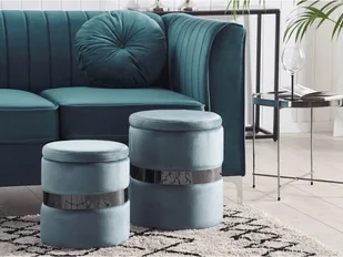 Komplet podnóżków ze schowkiem Ten dwuczęściowy zestaw, choć nie zajmuje dużo miejsca, może całkowicie odmienić wygląd twojego wnętrza. Pięknie zaokrąglony kształt obity welurem w delikatnym odcieniu błękitu, wniesie dużą dawkę stylu glamour. Metaliczna obręcz podkreśla połysk tapicerki i podkreśla luksusowy design podnóżków. Łącząc styl i funkcjonalność, te pufy pozwolą Ci rozprostować nogi, położyć książkę, a także ukryją koc czy gazety w swoim głębokim schowku. Ten dodatek do domu będzie wyglądać fantastycznie umiejscowiony obok sofy lub toaletki.