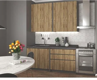 Meble Trida to efektowna kombinacja frontów w niebanalnym kolorze dąb votan z intrygującym i wyrafinowanym korpusem i blatem o wybarwieniu antracyt. To nieszablonowe połączenie tworzy luksusowe, odważne wnętrze, przyciągające spojrzenia odwiedzających Cię rodziny i przyjaciół. Nadzwyczajna trwałość i dokładność wykonania. Zestaw mebli do kuchni Trida charakteryzuje się wyjątkową trwałością i starannością wykonania. Szafki wyprodukowano z laminowanej płyty meblowej o klasie higieny E1, uszlachetnionej cienkimi filmami melaminowymi.