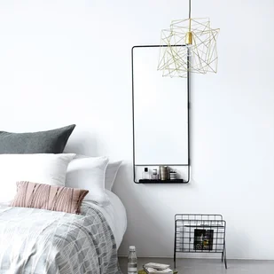 Lustro ścienne z półką. Lustro w czarnej, metalowej ramie. Posiada półkę u dołu. Takie lustro nada się idealnie do łazienki. Na półce możesz umieścić drobne kosmetyki codziennego użytku.