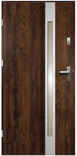 Drzwi zewnętrzne stalowe Temidas orzechowe 90 lewe o grubości 55 mm wykonane ze stali pokrytej folią dekoracyjną o strukturze i kolorze drewna, odporną na promieniowanie UV. Wypełnienie drzwi stanowi płyta z polistyrenu spienionego. Drzwi wyposażone są w dwa niezależne zamki trzypunktowe, trzy regulowane zawiasy, bolce przeciwwyważeniowe, uszczelki w ościeżnicy oraz progu, zestaw okuć i wkładek w systemie 1 klucza.