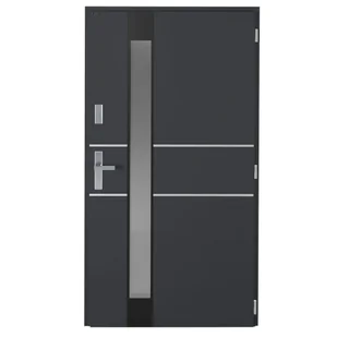 Drzwi zewnętrzne TITANIUM antracytowe 90 prawe to aluminiowo-stalowe drzwi wejściowe łączące świetne parametry techniczne z dużymi możliwościami aranżacyjnymi. W standardowym wyposażeniu znajduje się zamek główny wraz z zamkiem dodatkowym, które gwarantują szczelność drzwi i ochronę przed hałasem, chłodem i wiatrem. Jednoskrzydłowe drzwi zewnętrzne TITANIUM składają się z ościeżnicy wykonanej z kształtowników aluminiowych trzykomorowych, z przegrodą termiczną o głębokości 50 [mm] oraz skrzydła z grubą przylgą o grubości 62 [mm] wykonanego z blachy stalowej o grubości 0,75 [mm]. Wypełnienie skrzydła Skrzydło drzwi TITANIUM o grubości 62 [mm], składa się z dwóch arkuszy blachy stalowej ocynkowanej pomiędzy którymi znajduje się płyta XPS. Skrzydło drzwi jest przeszklone szybą wpuszczaną, dwukomorową, wykończoną naklejanymi aplikacjami ze stali nierdzewnej od strony wewnętrznej skrzydła i malowanymi w kolorze czarnym od strony zewnętrznej skrzydła.