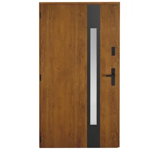 Drzwi wejściowe THOR 90 lewe złoty dąb to aluminiowo-stalowe drzwi zewnętrzne łączące świetne parametry techniczne z dużymi możliwościami aranżacyjnymi. W standardowym wyposażeniu znajduje się zamek główny wraz z zamkiem dodatkowym, które gwarantują szczelność drzwi i ochronę przed hałasem, chłodem i wiatrem. Jednoskrzydłowe drzwi zewnętrzne THOR składają się z ościeżnicy wykonanej z kształtowników aluminiowych trzykomorowych, z przegrodą termiczną o głębokości 50 [mm] oraz skrzydła z grubą przylgą o grubości 62 [mm] wykonanego z blachy stalowej o grubości 0,75 [mm]. Skrzydło drzwi THOR o grubości 62 [mm], składa się z dwóch arkuszy blachy stalowej ocynkowanej pomiędzy którymi znajduje się płyta XPS. Skrzydło drzwi jest przeszklone szybą wpuszczaną, dwukomorową SILVER (z efektem lustra weneckiego) wykończone od strony zewnętrznej naklejaną aplikacją malowaną w kolorze czarnym.