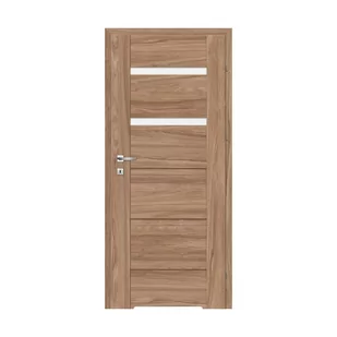 Skrzydło drzwiowe z kolekcji Tinos 80 prawe łazienkowe z podcięciem wentylacyjnym wykonane jest w konstrukcji ramowej. Wykończenie powierzchni stanowi okleiną 3D w kolorze orzech karmel o strukturze i rysunku drewna, wspaniale imituje powłokę naturalnego forniru. Zaletą folii wykończeniowej jest odporność na zarysowanie i ścieranie. Skrzydło posiada dwie poziome szyby białe matowe. Skrzydło pasuje do nowoczesnych i jasnych wnętrz.