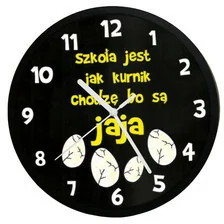 Solidny zegar naścienny z oryginalną tarczą przeznaczoną dla pilnego ucznia. Obudowa zegara została wykonana z wysokiej klasy plastiku. Solidna ramka pokryta jest kolorem metodą natrysku co daje efekt zmatowienia. Do wyboru są dwa kolory ramki: srebrny i czarny .