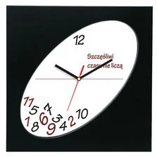 Polecamy kwarcowy zegar naścienny z zabawną tarczą dla osób nie przejmujących się upływem czasu. Kwadratowa plastikowy obudowa z tarczą w kształcie elipsy. Posiada oryginalny nadruk na tarczy. Czas wskazują trzy aluminiowe wskazówki. Podstawowa wersja zegara posiada mechanizm o krokowym ruchu sekundnika.