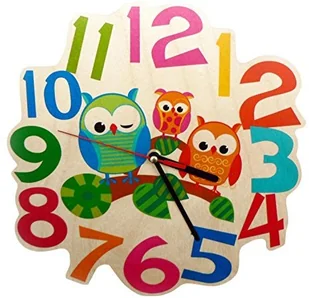 Hess Holzspielzeug 30001 - zegar ścienny z drewna dla dzieci, seria sowa, z mechanizmem kwarcowym, ręcznie wykonany, średnica ok. 21 cm, kolorowy wskaźnik czasu do pokoju dziecięcego