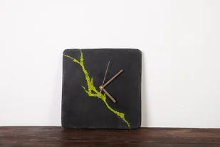 Zegar z betonu architektonicznego z chrobotkiem reniferowym. Zegar ręcznie wykonany z betonu architektonicznego barwionego na kolor ciemnografitowy z chrobotkiem reniferowym umieszczonym w szczelinie ...