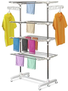 Stojąca suszarka na kółkach z czterema poziomami zapewni Ci bardzo dużo miejsca na pranie. Dzięki kółkom można ją swobodnie przemieszczać, co pozwala na użytkowanie suszarki także na zewnątrz. Klasyczne kolory: biały i srebrny pasują do każdego wnętrza. Dodatkowe zalety to wysokiej jakości wykonanie i możliwość złożenia suszarki w celu zaoszczędzenia miejsca.