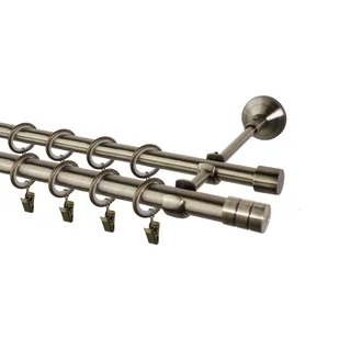 Karnisz podwójny o długości 240 cm w kolorze antycznego złota pomoże Ci stworzyć dekorację, jak również zadbać o prywatność we wnętrzu. Antyczne złoto doskonale komponuje się z klasycznymi, eleganckimi meblami. Podwójny karnisz pozwala na zawieszenie firan i zasłon. Tradycyjne kółka z żabkami sprawdzą się w przypadku tkanin wykończonych taśmą marszczącą. Możemy również ściągnąć dołączone kółka i zawiesić firany, zasłony na przelotkach, ponieważ wsporniki karnisza są otwarte, co ułatwi nam to zadanie.