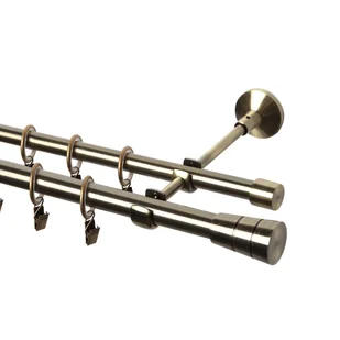 Karnisz podwójny o długości 200 cm dostępny pozwoli na zawieszenie zasłony bądź firany. Na cieńszym drążku wieszamy firankę, na grubszym zasłonkę. Karnisz z żabkami pozwoli na zawieszenie firany, zasłony na taśmie marszczącej. Można również ściągnąć załączone kółka i wybrać rozwiązania tkanin na przelotkach. W skład kompletu wchodzi karnisz z zakończeniami, wsporniki otwarte ścienne oraz kółka cichobieżne.