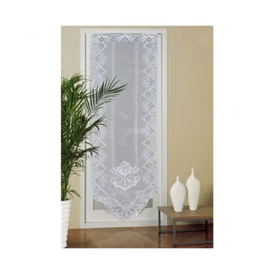 - Przezroczyste koronkowe zasłony zdobią kwiatowe wzory na białej tkaninie.