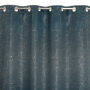 Zasłona CALLIOPE na przelotkach 135 x 260 cm zielono złoty Zawieszana na przelotkach, zaciemniająca zasłona CALLIOPE to niezwykle elegancki wybór, który świetnie wpisze się w wystrój szykownego salonu czy też klasycznie urządzonej sypialni. Stylowo wykończy przestrzeń okienną, zapewni przyjemne zaciemnienie pomieszczenia, kiedy tego chcemy, oraz ochroni przed wścibskimi spojrzeniami z zewnątrz. Model ten łączy ciemną, głęboką zieleń z efektownym złotym deseniem, co nadaje całości kompozycji nowoczesny, elegancki i odważny charakter. Sposób zawieszenia na kółkach sprawia, że zasłona płynnie się przesuwa i daje się ładnie drapować. Zasłona CALLIOPE wykonana jest z trwałego poliestru o gramaturze 0,76 g/m2 i dobrej odporności barw na działanie światła, dzięki czemu zachowa swój piękny wygląd przez długi czas.