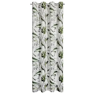 Miękka i delikatna w dotyku zasłona z przyjemnej welwetowej tkaniny, którą zdobi modny motyw egzotycznych liści w intensywnej zielonej kolorystyce na białym tle. Kontrastujące kolory naniesione na miękką tkaninę tworzą niezwykłą kompozycję dedykowaną modnym wnętrzom, urządzonym w stylu botanic. Praktyczne przelotki sprawiają, że zmiana dekoracji trwa tylko krótką chwilę, a tkanina pięknie się prezentuje po zawieszeniu na karniszu. Grubsza tkanina świetnie izoluje światło słoneczne zapewniając przyjemny klimat we wnętrzu. Uwaga: tkanina posiada nadruk tylko z jednej strony, druga strona jest w kolorze białym.